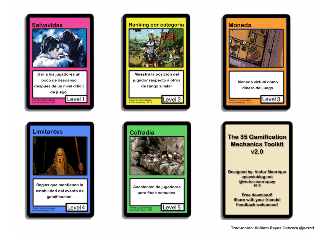 El sitio epicwinblog.net ofrece algo llamado The 35 Gamification Mechanics Toolkit, que es un listado, a manera de cartas, de 35 mecánicas que puede utilizarse para gamificación.